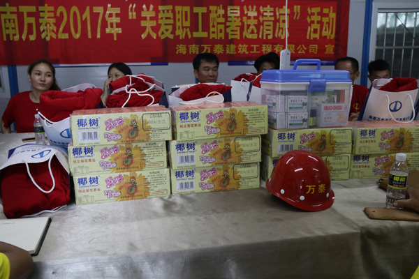 本次送清涼活動(dòng),海南萬泰公司共送出14箱菊花茶,400件T恤以及部分應(yīng)急醫(yī)藥品。項(xiàng)目部林總代表項(xiàng)目工人對(duì)公司的關(guān)懷及慰問表示由衷的感謝。