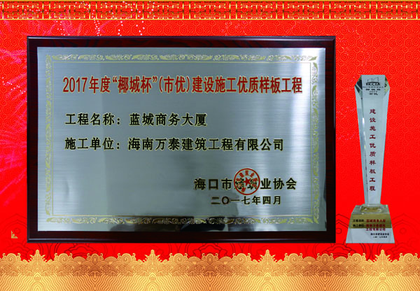 2015年3月,由萬泰承建的【藍(lán)城商務(wù)大廈】工程,榮獲海南省建設(shè)工程質(zhì)量安全檢測協(xié)會頒發(fā)的2015年度《海南省建筑施工優(yōu)質(zhì)結(jié)構(gòu)工程》。