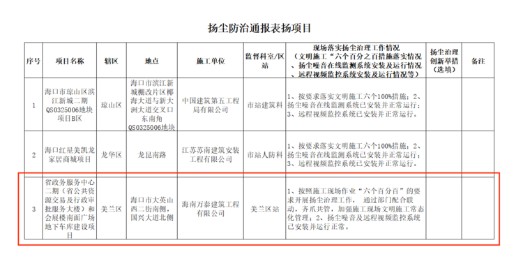 根據《2021年大氣治理沖刺階段管控措施清單》,??谑凶〗ň謱κ鼙O在建項目工地進行打分考核,列出第一批紅黑榜,對在揚塵防治方面表現突出的前3名受監在建項目工地記入??谑薪ㄖさ負P塵治理“紅榜”,對排名在后5名的受監在建項目工地記入??谑薪ㄖさ負P塵治理“黑榜”。海南萬泰承建的省政務中心二期(省公共資源交易及行政審批服務大樓)和會展樓南面廣場地下車庫建設項目因按照施工現場作業“六個百分百”的要求開展揚塵治理工作,通過部門配合聯動,齊抓共管,加強施工現場文明施工常態化管理,且揚塵噪音及遠程視頻監控系統均以安裝并運行正常等,榮登海口市建筑工地揚塵治理“紅榜”。