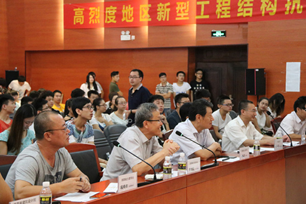 此次參賽的70支隊伍按照賽前抽簽順序分別進行了加載測試。加載前,先由選手小心的將30公斤的鐵塊輕放在由竹皮、502膠水粘制而成的四層塔架上,塔架頂層還要放置4立升的水箱。參賽隊員就其模型的設計思路、傳力路徑、構造特點及創新之處等方面做2分鐘陳述。參賽作品各具特色,構思新穎,體現出了參賽隊員扎實的力學與結構知識、活躍的思維、豐富的想象力及較強的創新意識。隨后,評委老師提問,參賽隊員答辯;提問內容多涉及基本力學及結構概念、模型受力性能等。之后,進行模型加載。加載共分三級,加載的控制位移依次增大;加載級數的遞增不僅考驗著模型的牢固性,更左右著參賽隊員和觀眾們的心情。整個環節,工作人員各司其職,現場組織有條不紊,氣氛熱烈。
