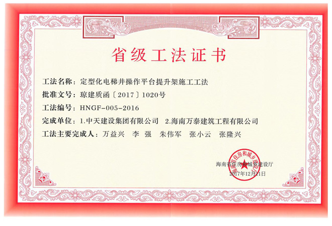 2017年12月5日,海南省住房和城鄉建設廳發布公告,公布了2016年度海南省省級工法名單。海南萬泰建筑工程有限公司申報的兩項工法(定型化電梯井操作平臺提升架施工工法、加強斜屋面施工質量的組合施工工法)名列榜單,且得票數均為13票,得票率百分之百。