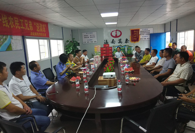 海南萬泰建筑工程有限公司五指山清能·麗景灣一期一標項目部在會議室組織農民工工資集體發放暨海南萬泰建筑工程有限公司“送清涼”活動。此次共計發放農民工工資150余萬元現金。共送去夏季防暑涼茶50箱、綠豆300斤、冰糖150斤等一批物質。